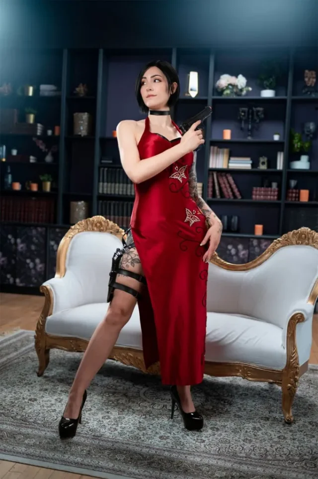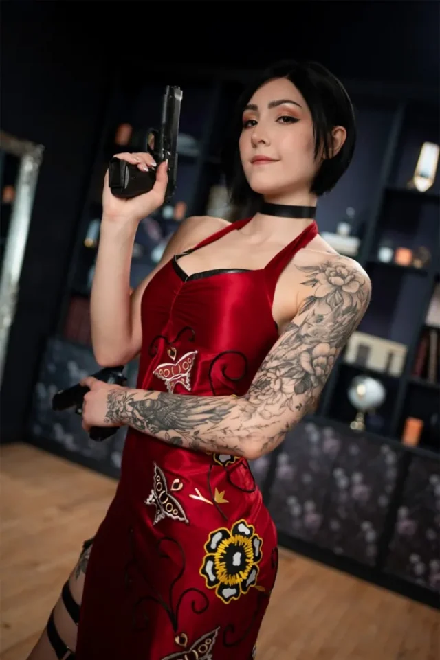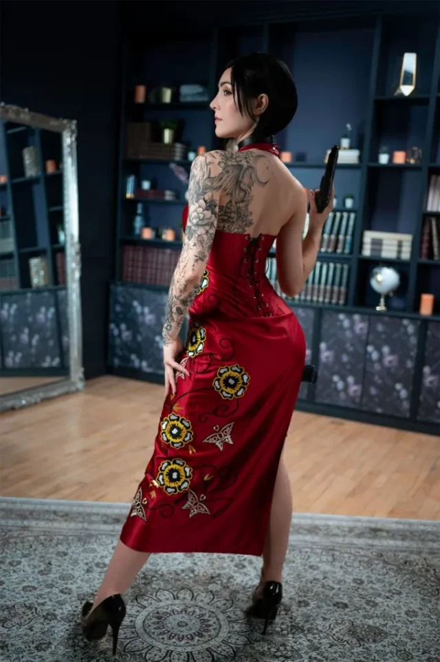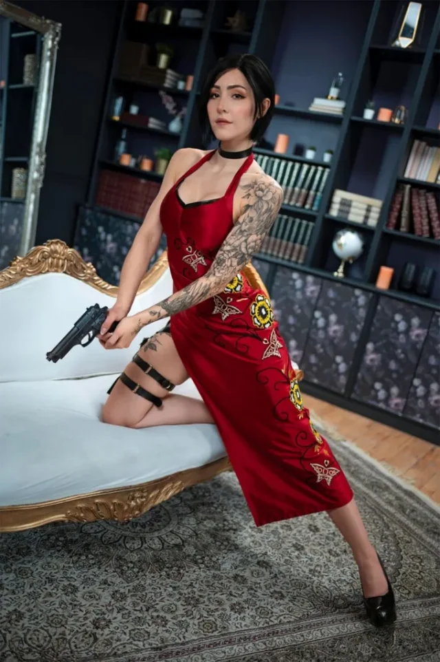 而在Luxlo的艾达·王 cos中,Luxlo不仅成功还原了角色的标志性外貌——那袭充满危险感的红裙与冷艳的眼神,还巧妙加入了自己的创意。她的手臂和腿部纹身为角色增添了现代酷感,使艾达显得更加真实,仿佛从僵尸横行的浣熊市直接穿越到了我们身边。Luxlo的身材曲线与西方美学的结合,也让她在还原的基础上赋予角色新的生命力。